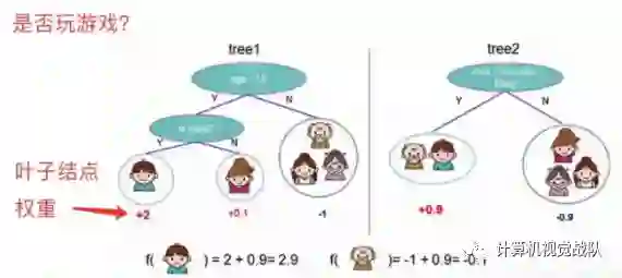 看图例右边的「tree2」,它和左边的不同在于它使用了另外的指标,出了年龄和性别,还可以考虑使用电脑频率这个划分属性。通过这两棵树共同帮我们决策当前这个人愿不愿意玩游戏,小男孩在「tree1」的权值是+2,在「tree2」的权值是+0.9, 所以小男孩最终的权值是+2.9(可以理解为得分是+2.9)。老爷爷最终的权值也是通过一样的过程得到的。