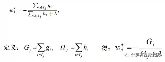 此时我们的目标是求每棵树的叶节点j的分数Wj,求出Wj后,将每棵树的Wj相加,即可得到最终的预测的分数。而要想得到最优的Wj的值,即最小化我们的目标函数,所以上式对Wj求偏导,并令偏导数为0,算出此时的W*j为: