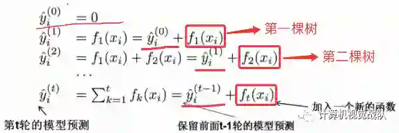 一开始树是0,然后往里面加树,相当于多了一个函数,再加第二棵树,相当于又多了一个函数...等等,这里需要保证加入新的函数能够提升整体对表达效果。提升表达效果的意思就是说加上新的树之后,目标函数(就是损失)的值会下降。