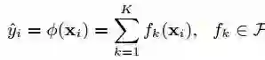 在讨论学习目标之前,先说一说XGBoost是如何预测输出值的。XGBoost是一个树集成模型,它使用的是K(树的总数为K)个树的每棵树对样本的预测值的和作为该样本在XGBoost系统中的预测,定义函数如下: