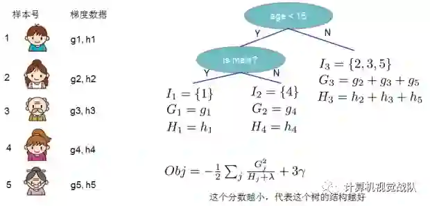 上面的方程可以用作得分(score)函数来测量树结构q的质量。该得分类似于评估决策树的不纯度得分,除了它是针对更广泛的目标函数得出的。下图表示得分(score)是如何被计算的: