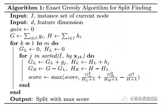 为了找到节点最好的划分,该算法的原理是在所有特征上枚举所有的可能的划分,我们称这个算法为Basic Exact Greedy Algorithm。大多数已存在的单台机器上的树提升算法库都是用这种方法实现的,例如scikit-learn,R’s gbm 以及 XGBoost的单机版本都支持这种算法。该算法要求为连续特征枚举所有可能的切分,这对计算机的要求很高,所以该算法为了有效的做到这一点,首先根据特征值排序数据并且按照顺序访问数据,以累积下面方程中结构分数的梯度统计量。