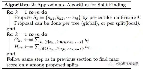 Basic Exact Greedy Algorithm是一个非常精确的算法,因为它枚举的所有可能的切分点。但是,当数据不能完全的加载到内存时,它可能不是特别有效地。同样的问题也出现在分布式的设置中。为了有效的支持在这两种设置中的有效的梯度提升,一个近似算法需要被使用。该算法首先根据特征分布的百分位数提出n个候选切分节点,然后,算法将位于相邻分位点之间的样本分在一个桶中,在遍历该特征的时候,只需要遍历各个分位点,从而计算最优划分。注意到上面算法流程中表明有全局的近似(global)和局部(local)的近似,所谓全局就是在新生成一棵树之前就对各个特征计算分位点并划分样本,之后在每次分裂过程中都采用近似划分,而局部就是在具体的某一次分裂节点的过程中采用近似算法。该算法如下所示: