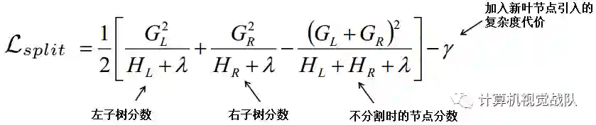 由上图可以看出,当我们指定一颗树的结构的时候,每棵树的得分(score)只与损失函数的一阶导数和二阶倒数相关(γ和λ是在实际应用中需要自己调参的),而该得分表示我们在目标上面最多减少多少。我们可以把它叫做结构分数(structure score)。你可以认为这个就是类似吉尼系数一样更加一般的对于树结构进行打分的函数。