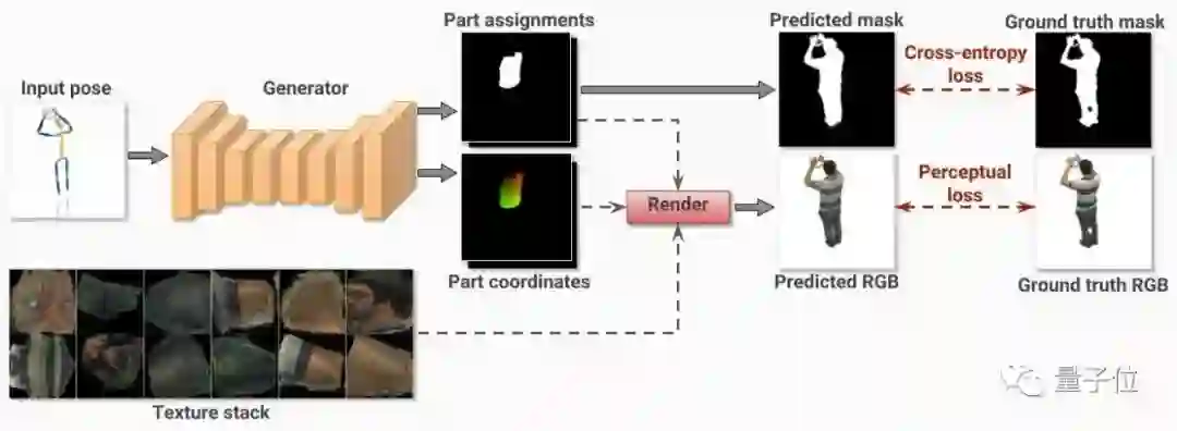 而神经网络的任务,只限于预测从纹理到输出图之间,需要怎样的图像形变/扭曲 (Warping) 。换句话说,把2D“皮肤”贴到3D人类的身上。