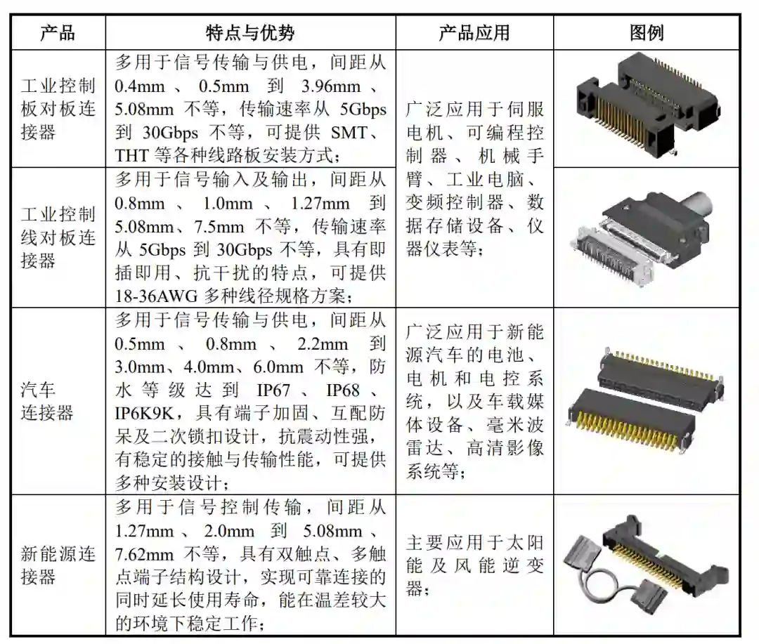 招股书显示,维峰电子主要从事工业控制连接器、汽车连接器及新能源连接器的研发、设计、生产和销售,产品主要应用于工业控制与自动化设备、新能源汽车“三电”系统、光伏逆变系统等系列应用场景。