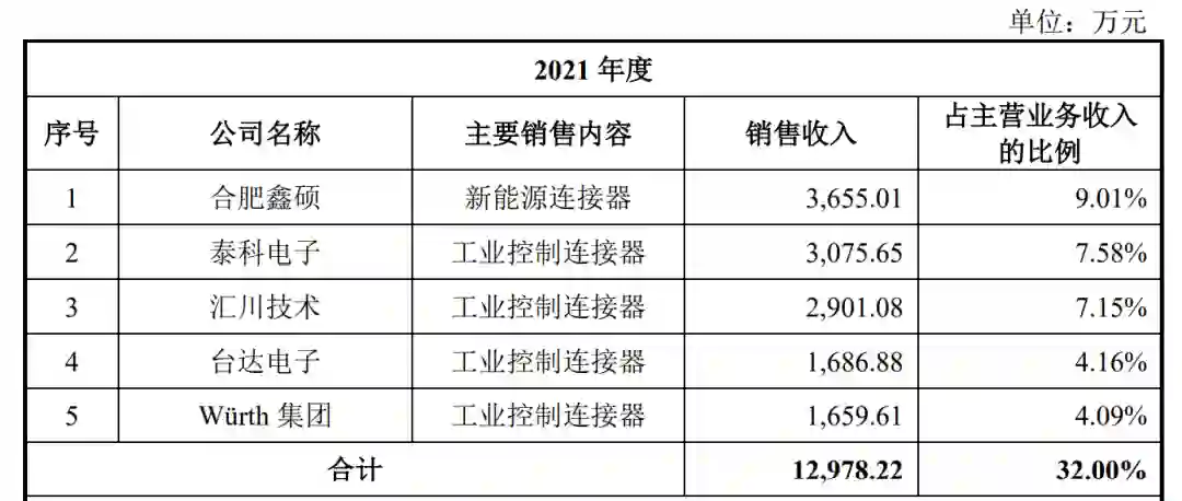 2018年,维峰电子与工控龙头汇川技术达成合作,进行了小规模销售。随着其产品受到认可,汇川技术本身的业绩上涨,维峰电子逐渐打开了国内工控连接器的市场。除了汇川技术,2021年维峰电子也成功与中国台湾的工控企业台达电子相绑定。第一大客户合肥鑫硕则是新能源领域的零部件厂商,下游终端客户是光伏逆变器巨头阳光电源。