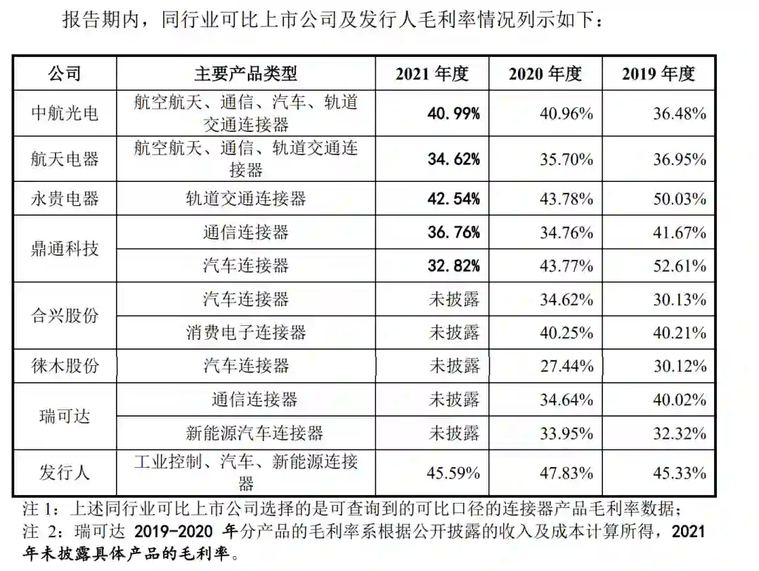 2021年,维峰电子工业控制连接器销售占比约73.81%,汽车连接器销售占比约14.48%,新能源连接器销售占比约10.68%。由于产品结构的不同,维峰电子的毛利率也确实高于同行可比公司。