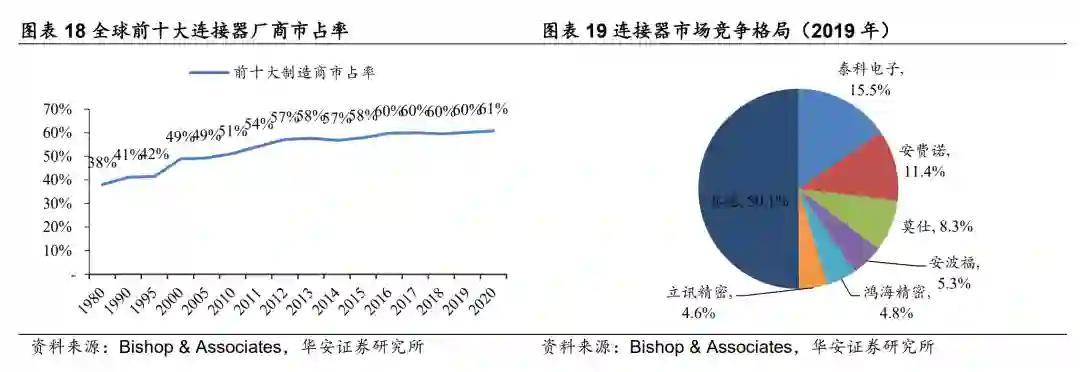 这主要体现在市场的集中度上,在全球,世界前十大连接器企业市场份额占比已从1995年的41.60%增长至2019年的61.44%。据统计,2000年后,连接器市场发生的并购就达到了463项。