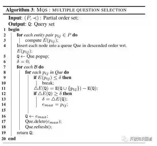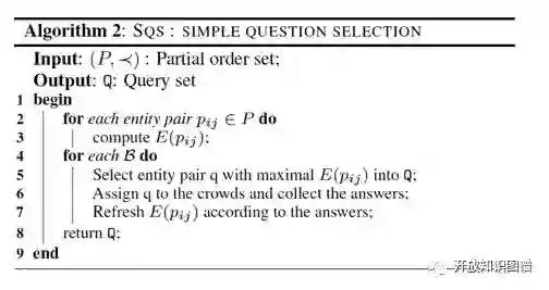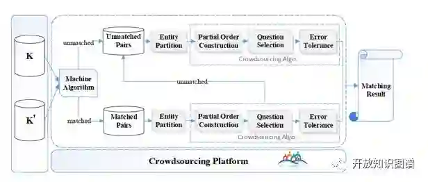 首先,通过机器学习方法对知识库进行粗略的实体对齐,然后分别将以对齐实体对(MatchedPairs)和未对齐实体对(UnmatchedPairs)放入众包平台,让人进行判断。两条流水线的步骤类似,主要包括四个部分:实体集划分(EntityPartition)、建立偏序(PartialOrder Construction)、问题选择(QuestionSelection)、容错处理(ErrorTolerance)。