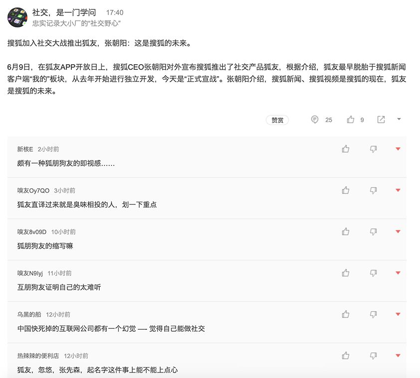 张朝阳表示:“未来,狐友有可能更大范围地引爆年轻人的社交,更多人将在这里找到同道中人,一起构建出一个属于独特兴趣领域自由发言的兴趣圈。”——至少从目前来看,作为250万人的关注对象,最大的兴趣圈围绕着张朝阳自己。