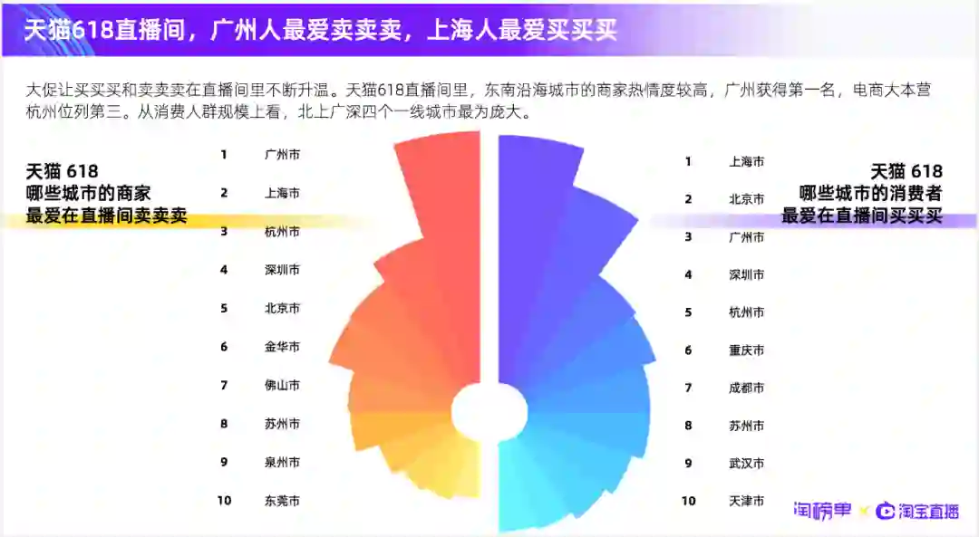《2020淘宝直播新经济报告》统计,截至今年2月,上海的淘宝直播用户群最庞大,而杭州拥有最多淘宝主播,约占总数的一成。天猫618期间,广州超越杭州,成为商家直播热情度最高的城市。