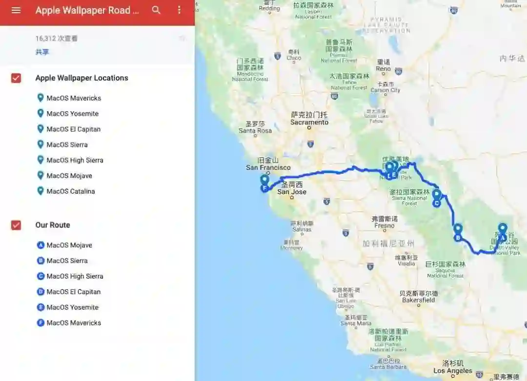 虽然整个翻拍过程很艰辛,但第一趟公路之旅还算轻松,因为这几张苹果壁纸的取景地都是在优美胜地、死亡谷等国家公园附近,像 High Sierras、El Capitan 的取景点,只需要花小半天时间,就能完成翻拍,角度也不算特别刁钻。