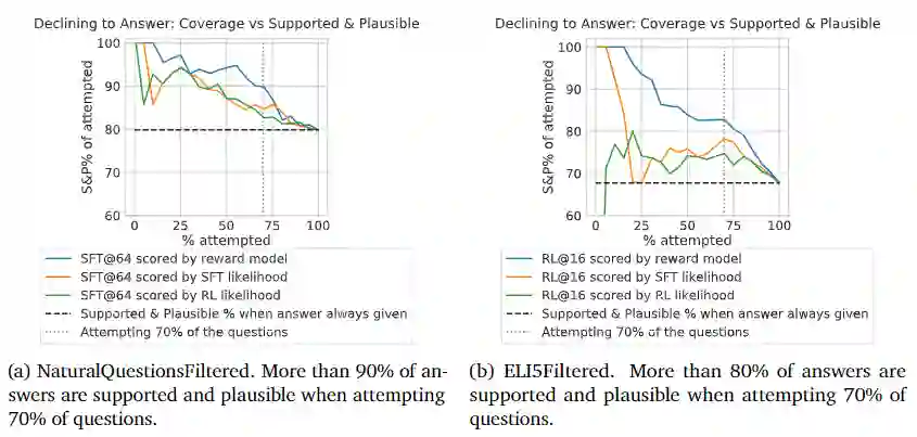 实验结果显示,在NaturalQuestionsFiltered数据集上,GopherCite回答70%的问题时,正确率达到了90%; 在 ELI5Filtered 数据集上回答 70%的问题时,正确率为80%左右。