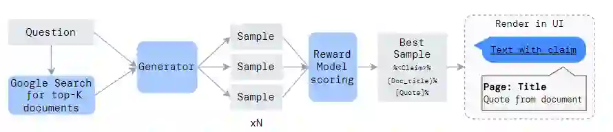 在强化学习的方案中,研究人员开发了一种奖励机制。收到一个问题后,模型会访问谷歌搜索的 API 来找到相关的网页,把前K个返回结果作为候选文本。