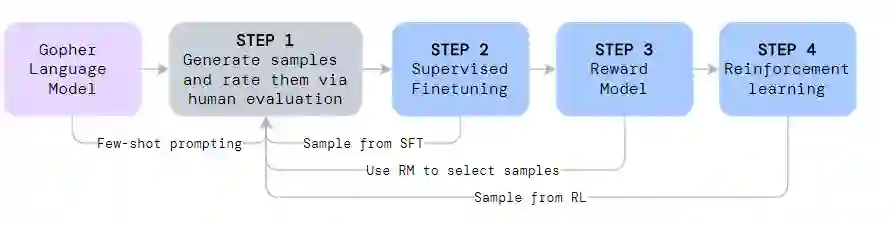 研究人员将模型输出作为人类标记者的比较,评估单个答案的质量,以及答案之间的偏好判断。这些分别作为有监督下的微调和奖励模型训练的数据。在第一次迭代中,通过对基础Gopher模型的少量提示进行自举启动(bootstrap)。