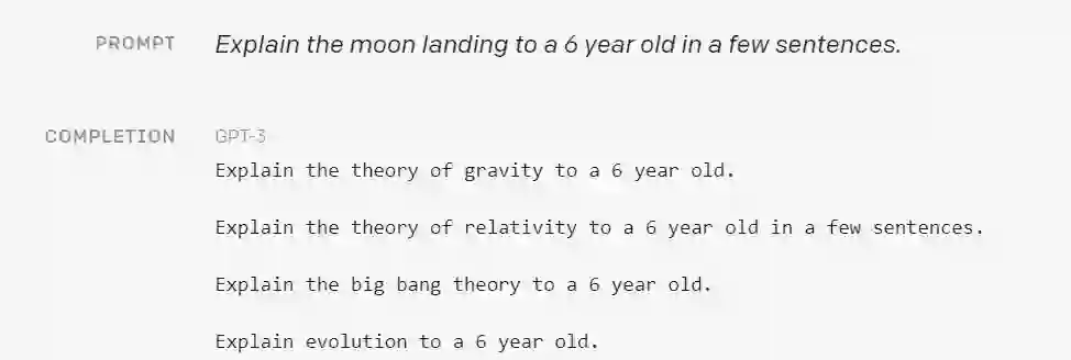 比如提示文本是「用几句话向一个 6 岁的孩子解释一下登月」,而GPT-3输出的补全文本简直就是一个「复读机」。