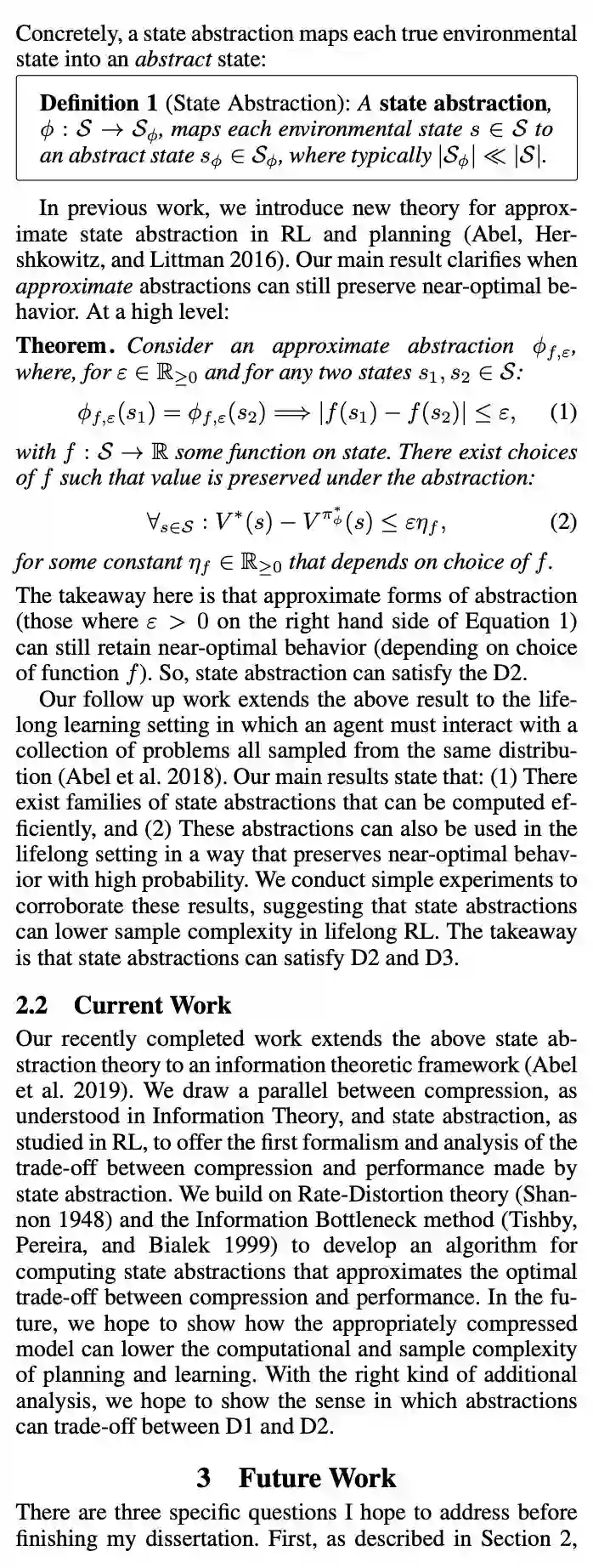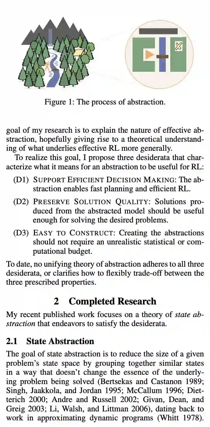 My interest in this question stems from its foundational role in many aspects of learning and decision making: agents can’t model everything in their environment, but must necessarily pick up on something about their surroundings in order to explore, plan far into the future, generalize, solve credit assignment, communicate, and efficiently solve problems. Abstraction is essential to all of these endeavors: through abstraction, agents can construct models of both their surroundings and behavior that are compressed and useful. The