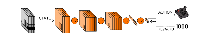 我们对基于价值函数的DRL算法的讨论,从深度Q网络(如下图所示)开始,该算法在经典Atari 2600视频游戏中获得了普遍的成功,性能堪比专业的视频游戏测试人员。DQN的输入是游戏的四个灰度帧,随着时间的推移连接,最初由几个卷积层处理,以便提取时空特征,例如“Pong”或“Breakout”中球的移动。最终,来自卷积层的特征图由几个全连接的层来处理,这更多隐含编码地动作的效果。这与使用固定预处理步骤的更传统的控制器形成对照,因此,它们不能适应其对学习信号的状态处理。