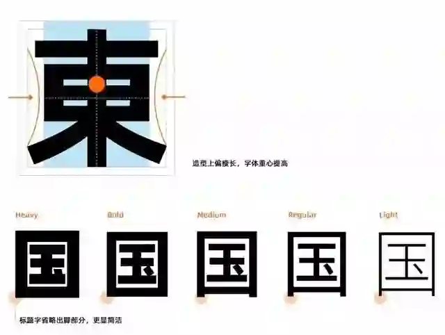 阿里定制字体共有 5 个字重(即粗细),其中 Light/Regular/Medium 较细的字体更适用于长文阅读,贴近底部的“口”字保留了出脚,保证了阅读时的流畅感;而 Bold/Heavy 两款较粗的字体更适用于标题场景,为了保证简洁的质感,切除了出脚,更容易体现出块面感。