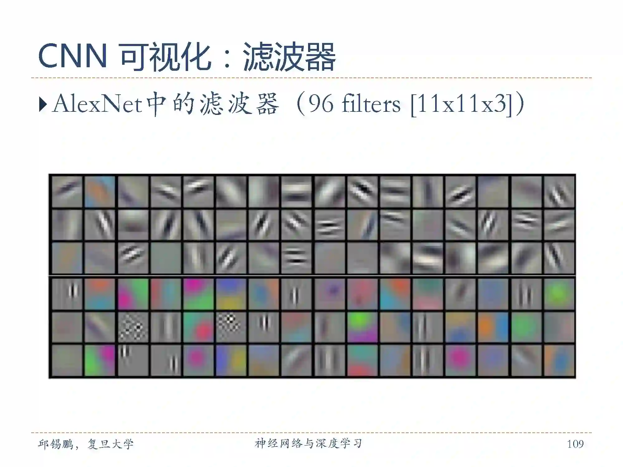 Krizhevsky等学习到的滤波器例子。这96个滤波器的尺寸都是[11x11x3],在一个深度切片中,每个滤波器都被55x55个神经元共享。注意参数共享的假设是有道理的:如果在图像某些地方探测到一个水平的边界是很重要的,那么在其他一些地方也会同样是有用的,这是因为图像结构具有平移不变性。所以在卷积层的输出数据体的55x55个不同位置中,就没有必要重新学习去探测一个水平边界了。