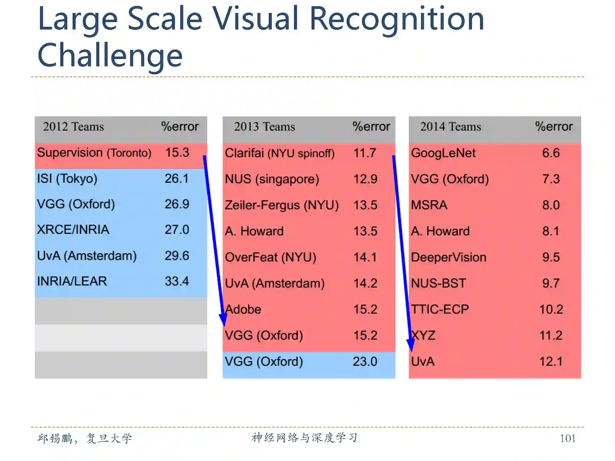 在ImageNet数据集上的图像分类比赛结果。可以看到12之后每一年的最差结果都能达到上年的最好结果。