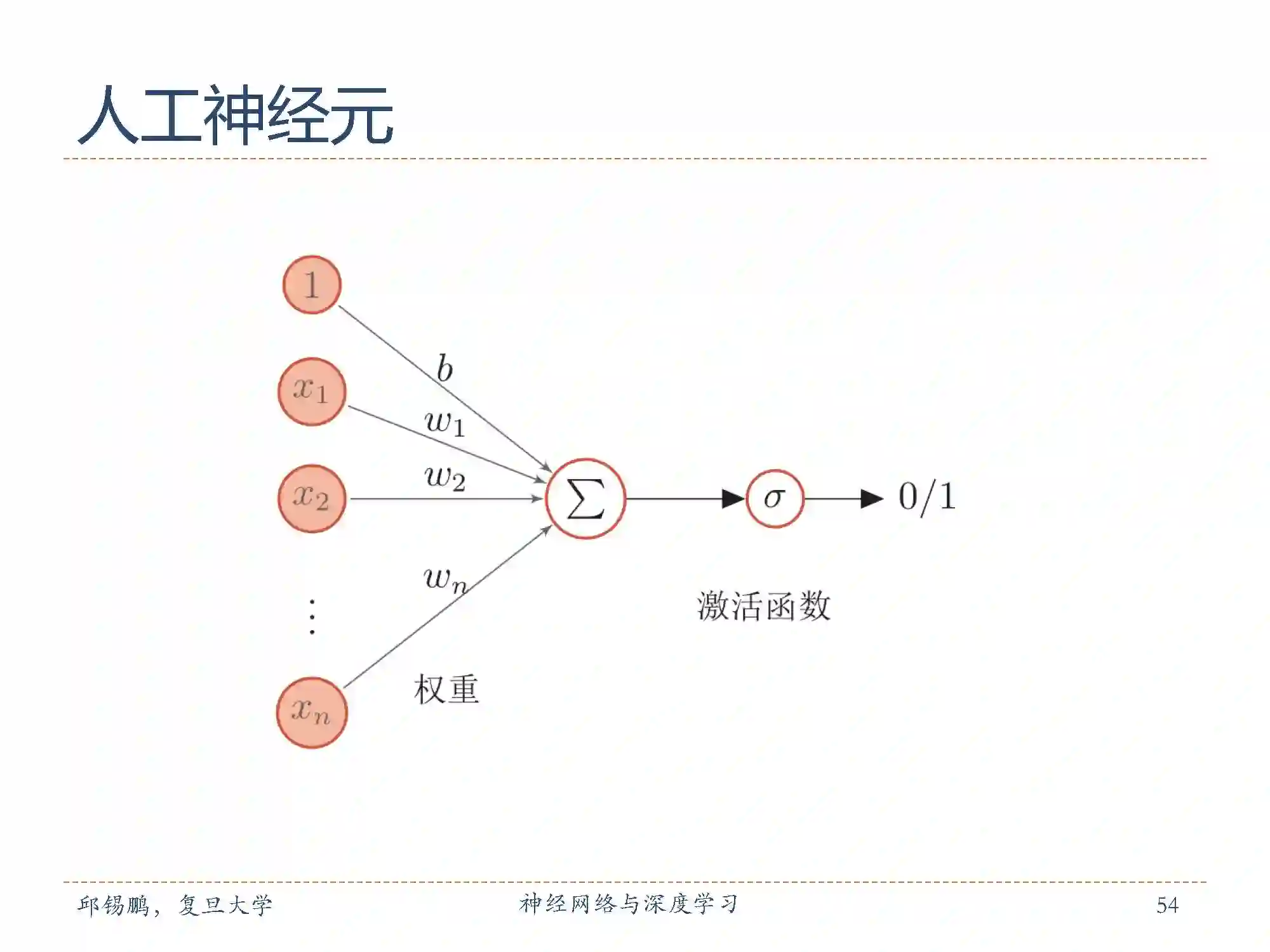 人工神经元(artificialneuron),简称神经元(neuron),是构成神经网络的基本单元,其主要是模拟生物神经元的结构和特性,接受一组输入信号并产出输出。