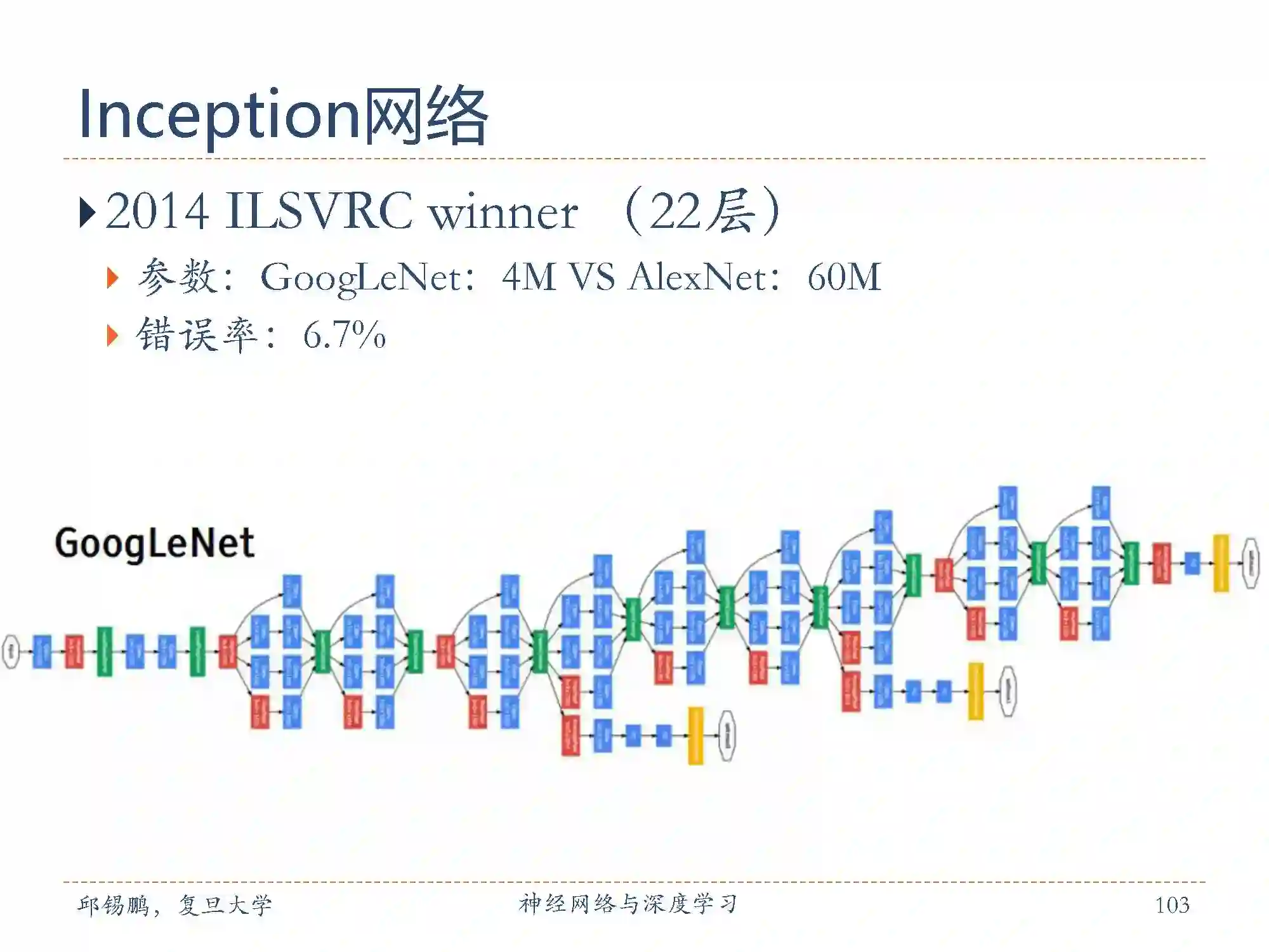 Inception网络最早的v1版本是非常著名的GoogLeNet[Szegedy et al., 2015] (如图5.14),并赢得了2014年ImageNet图像分类竞赛的冠军。