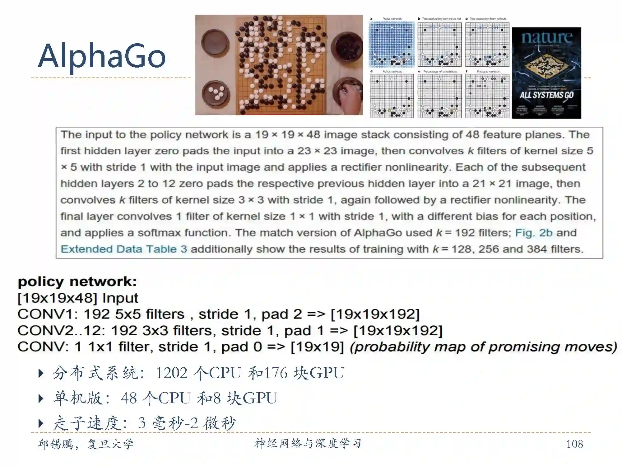 AlphaGo的前两个网络都是通过从KGS围棋服务器上获得的3000万个人类高手的对决棋盘状态(Position)进行有监督学习得到的。输入是棋盘状态,输出是人类高手的下一步走子位置。监督学习的策略网络使用了13层的深度卷积神经网络。