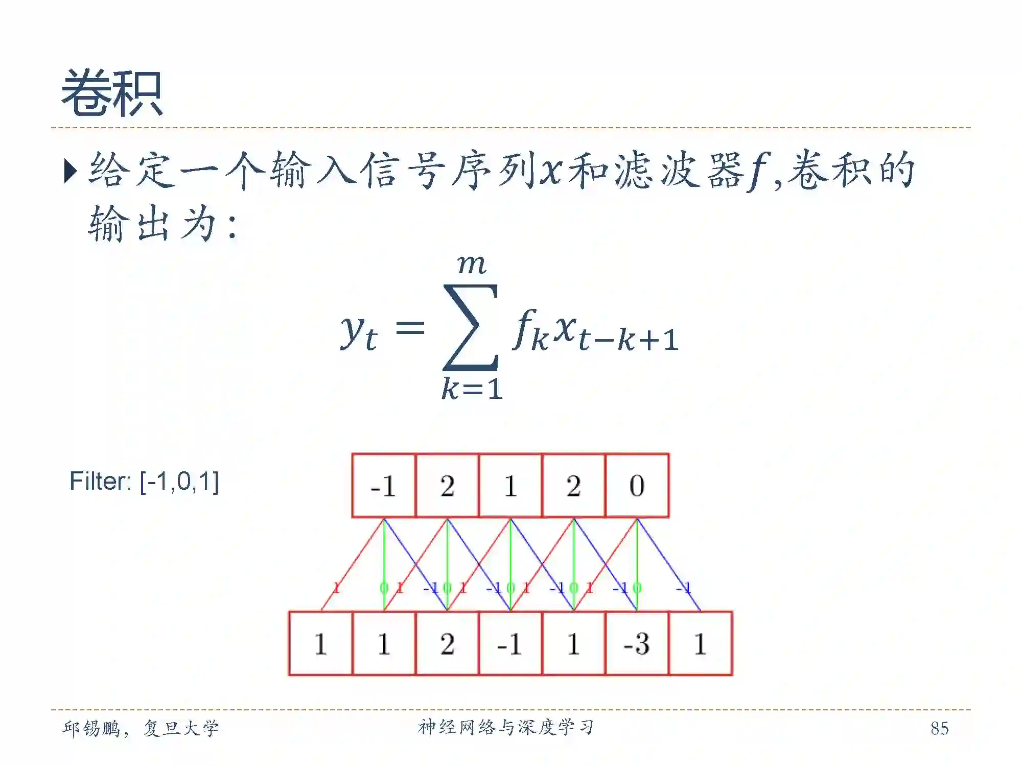 例子中卷积核为[-1, 0,1],输出向量的第一个值-1来自卷积核与与对应输出层的乘积 -1 = -1*1 + 0*1 + 2*2