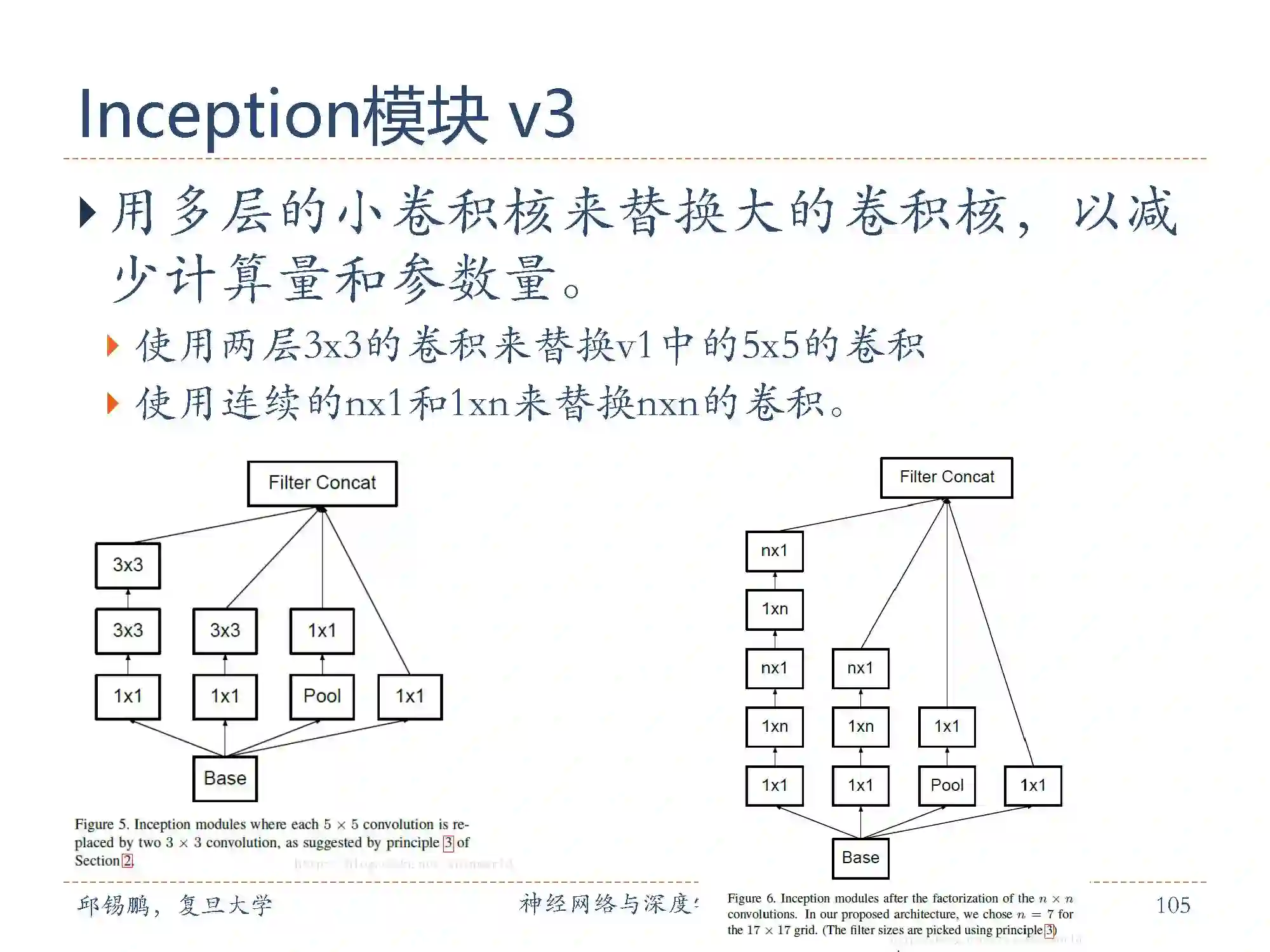 Inception网络有多个改进版本。其中比较有代表性的有Inceptionv3版本 [Szegedy et al., 2016],用多层的小卷积核来替换大的卷积核,以减少计算量和参数量。具体包括(1)使用两层3× 3的卷积来替换v1中的5 × 5的卷;(2)使用连续的n × 1和1 × n来替换n × n的卷积。Inception v3版本同时也引入了标签平滑以及批量归一化等优化方法进行训练。