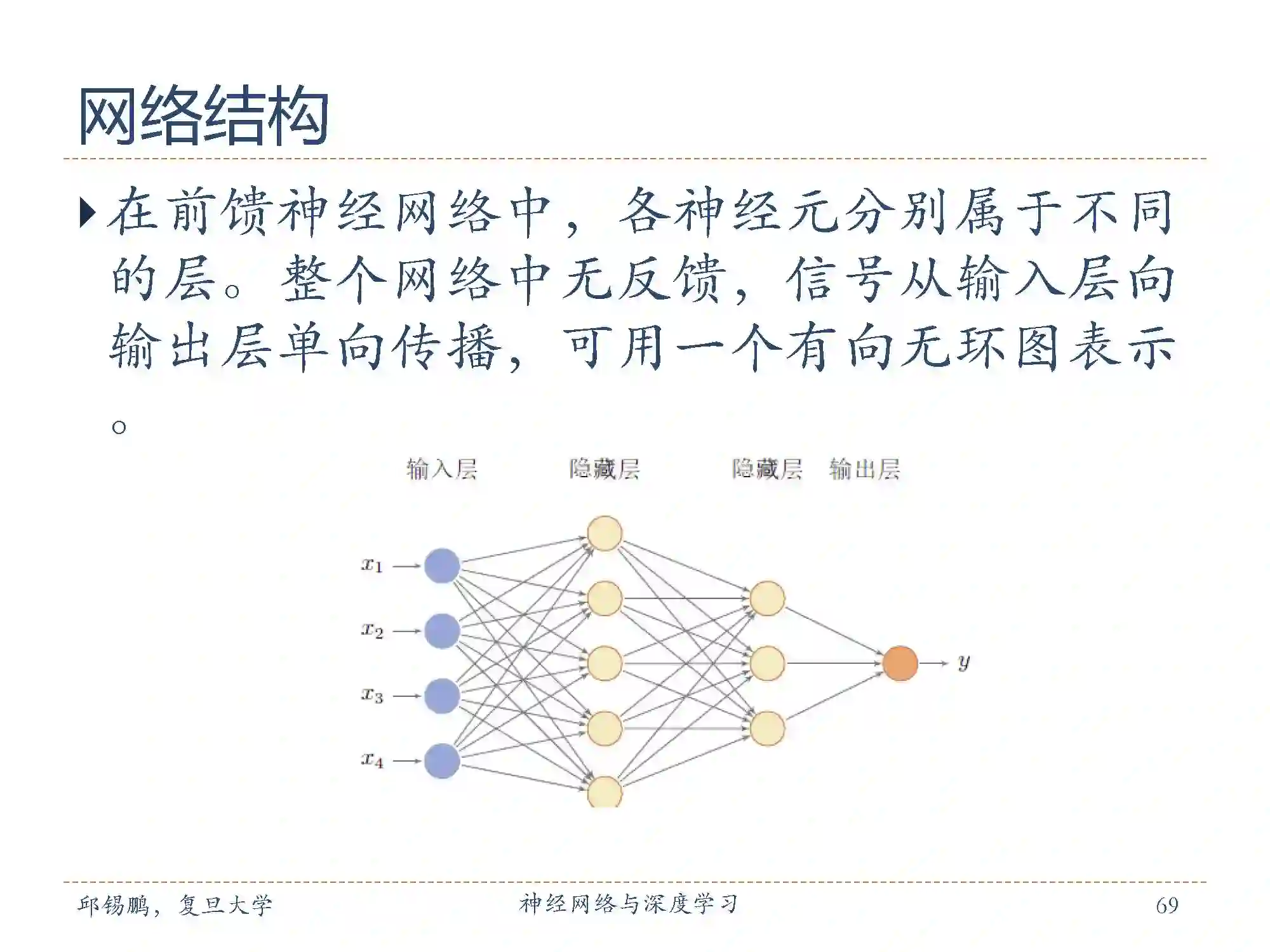 前馈网络可以用一个有向无环路图表示。前馈网络可以看作一个函数,通过简单非线性函数的多次复合,实现输入空间到输出空间的复杂映射。这种网络结构简单,易于实现。