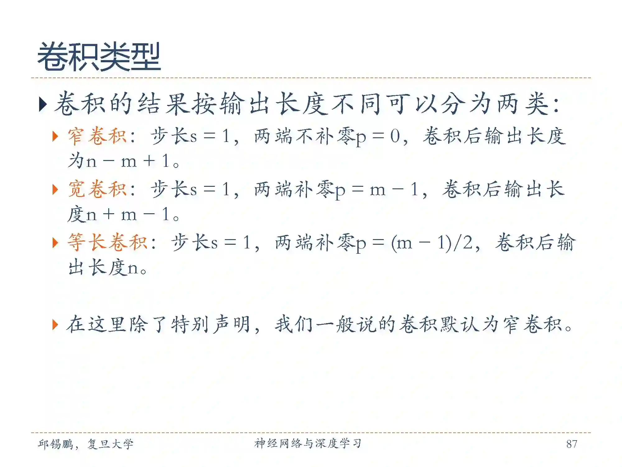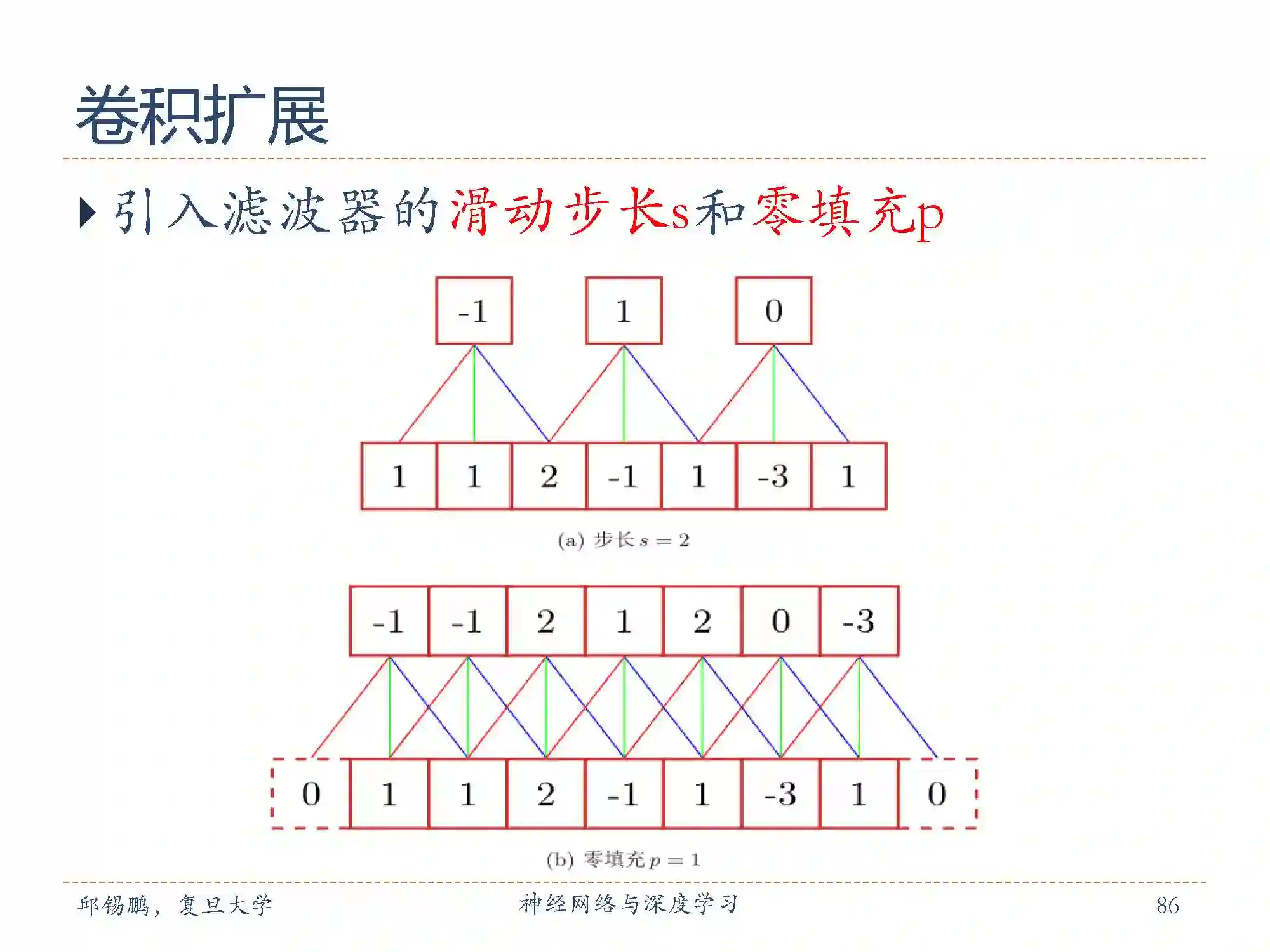 零填充(zero padding)是在输入向量两端进行补零。图中给出了输入的两端各补一个零后的卷积示例。假设卷积层的输入神经元个数为n,卷积大小为m,步长(stride)为s,输入神经元两端各填补 p个零(zero padding),那么该卷积层的神经元数量为 (n − m + 2p)/s + 1。