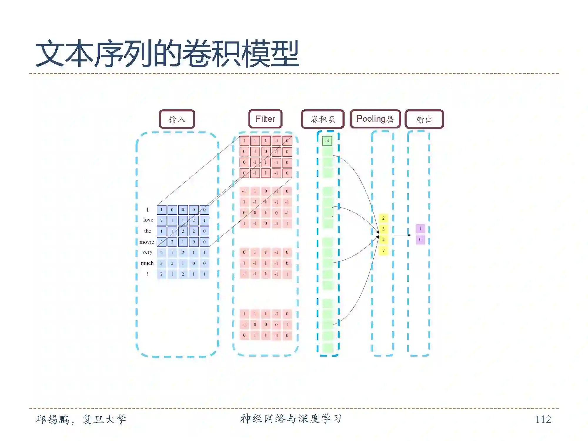 在把文本表示成为二维结构后可以用同样的卷积核汇聚层交替结构来形成卷积网络结构实现对文本的建模。