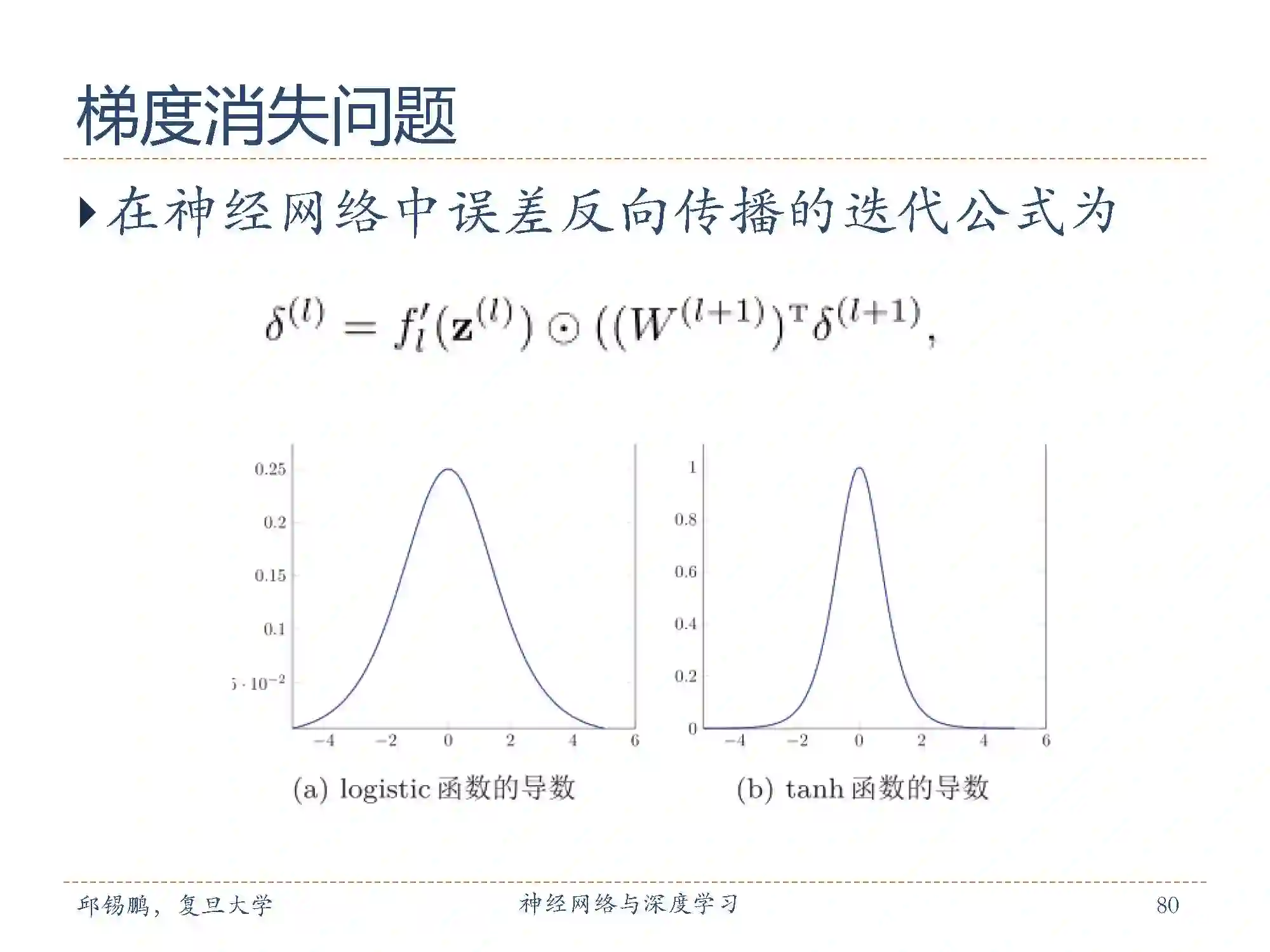 误差从输出层反向传播时,在每一层都要乘以该层的激活函数的导数。