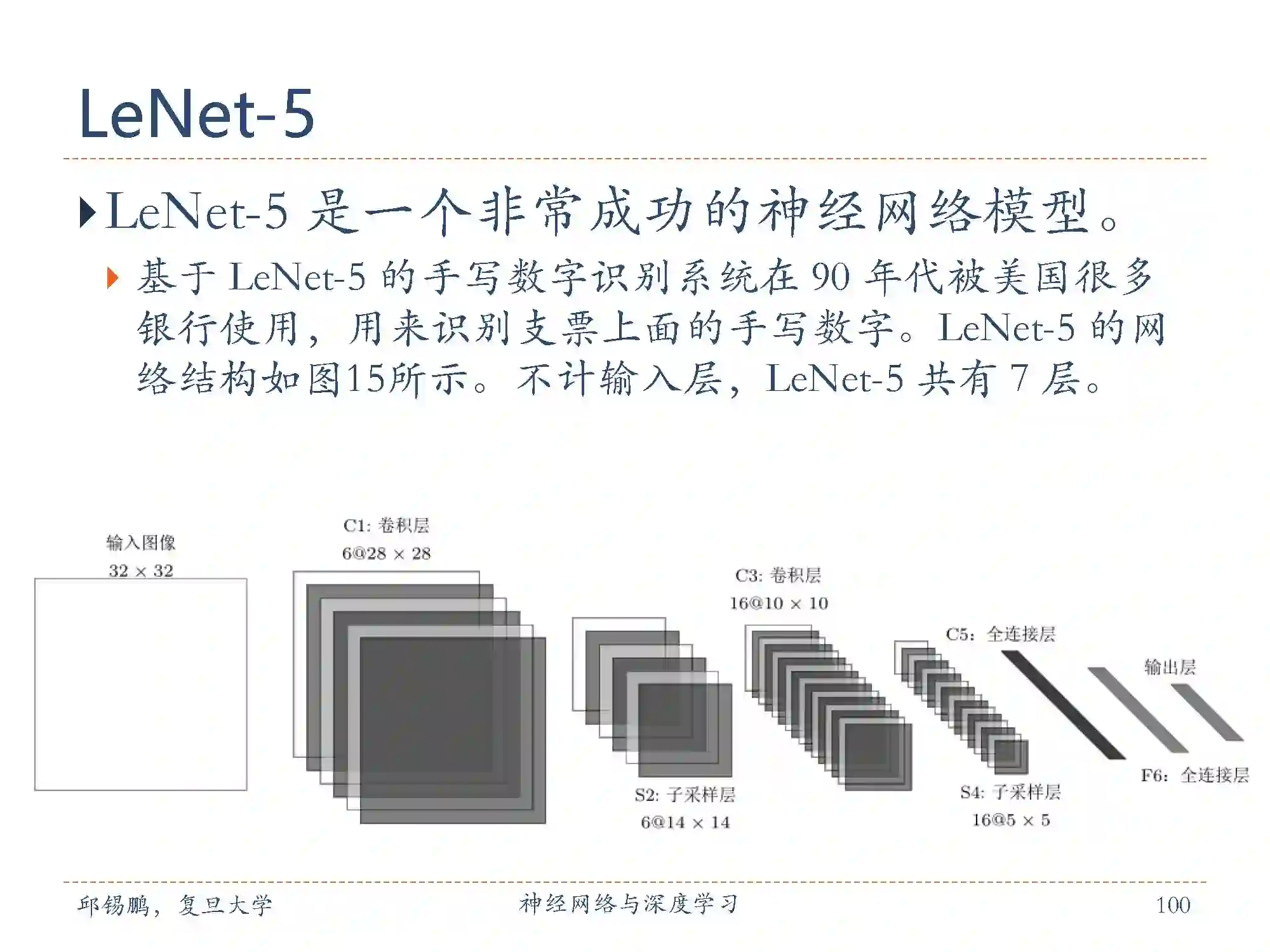 6. C5层是一个卷积层,使用120 × 16 = 1, 920个5 × 5的滤波器,得到120组大小为1 × 1的特征映射。C5层的神经元数量为120,可训练参数数量为1,920 × 25 + 120 = 48, 120,连接数为120× (16 × 25 + 1) = 48, 120。