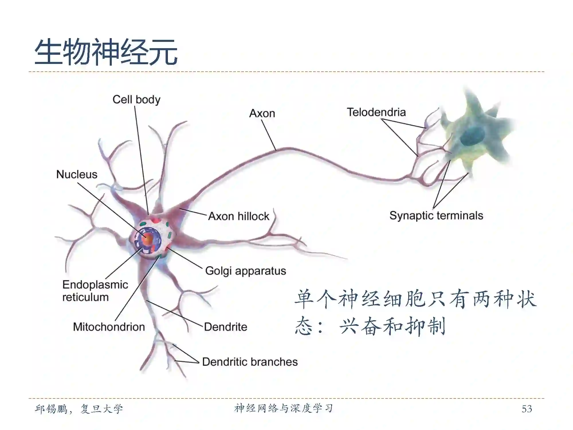 生物学家在20世纪初就发现了生物神经元的结构。一个生物神经元通常具有多个树突和一条轴突。树突用来接受信息,轴突用来发送信息。当神经元所获得的输入信号的积累超过某个阈值时,它就处于兴奋状态,产生电脉冲。轴突尾端有许多末梢可以给其他个神经元的树突产生连接(突触),并将电脉冲信号传递给其它神经元。