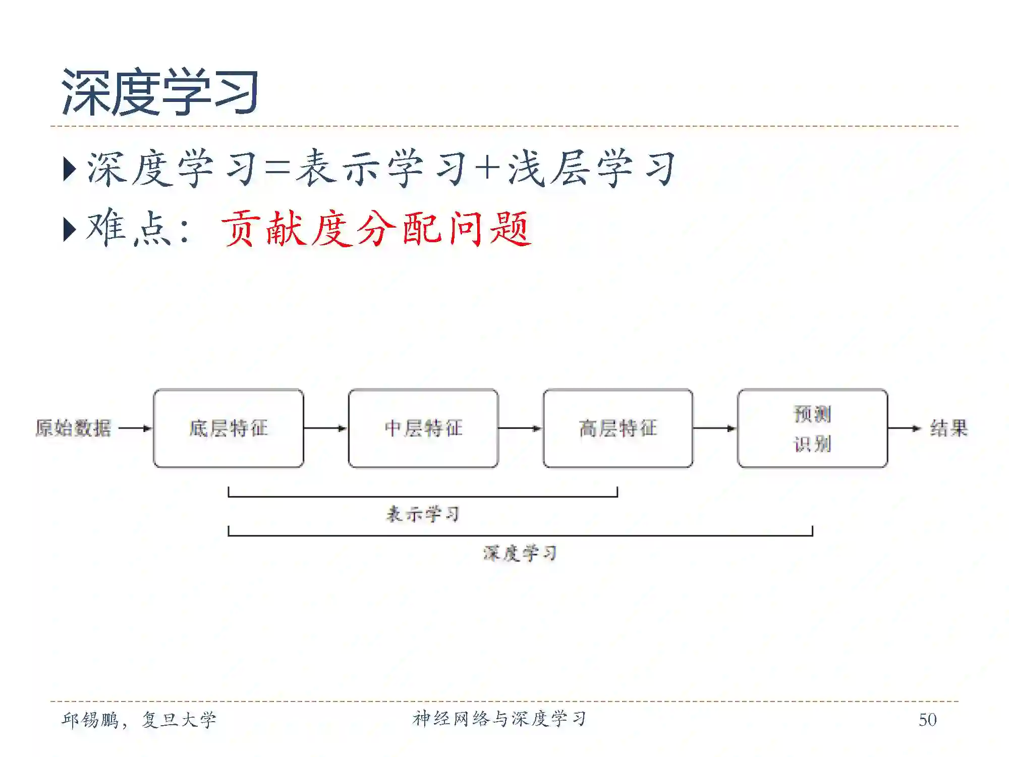 因此深度学习可以等价于 表示学习+浅层学习 这两部分。