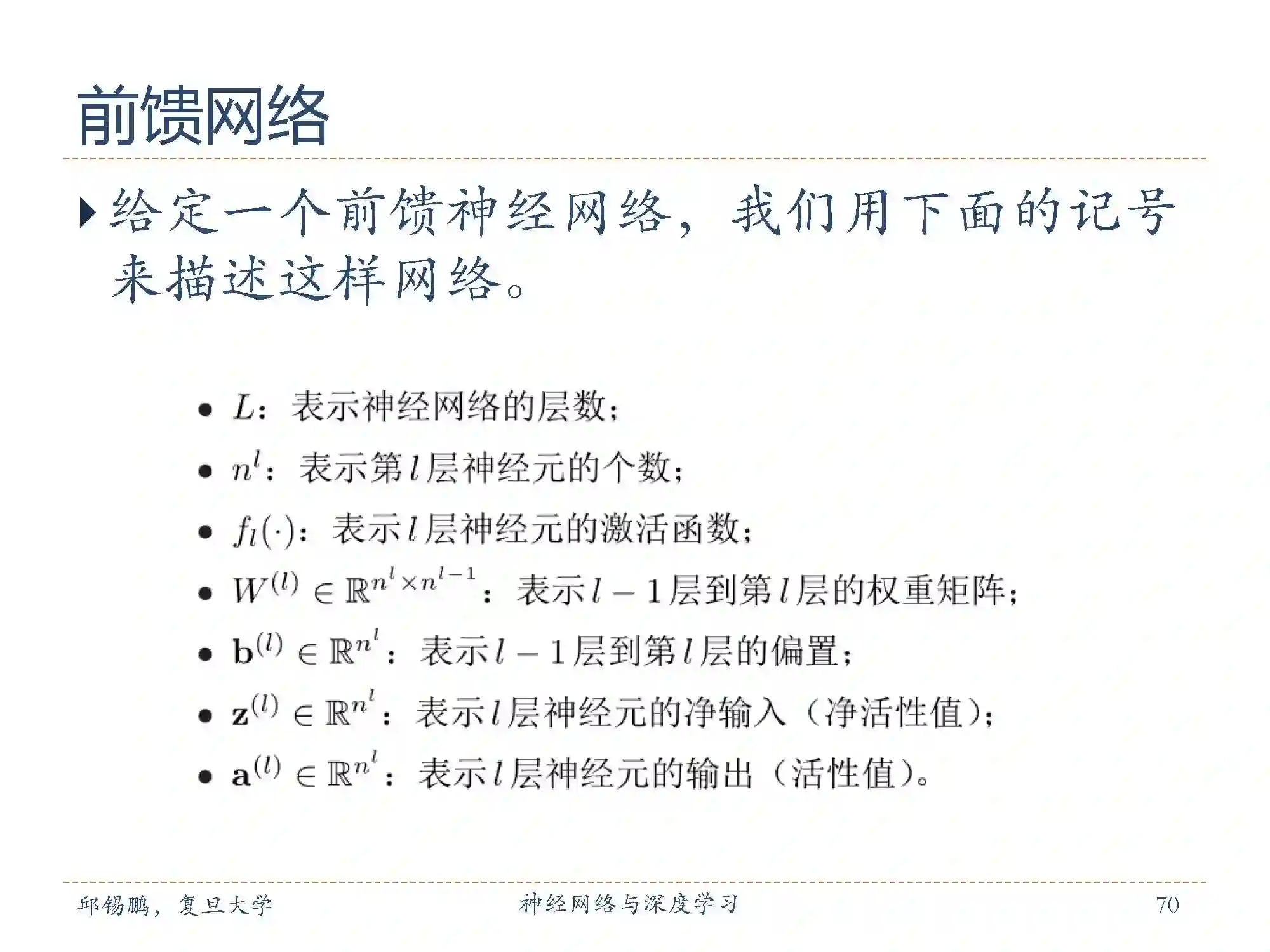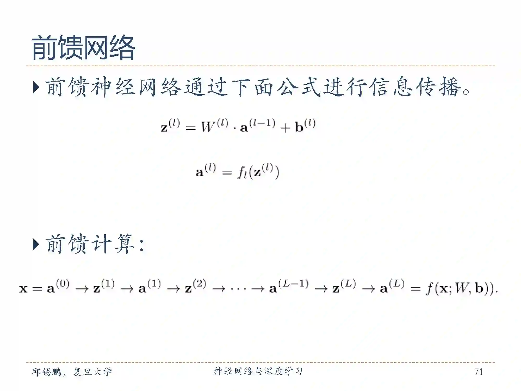 前馈神经网络通过下面的公式进行传播,逐层进行传播。