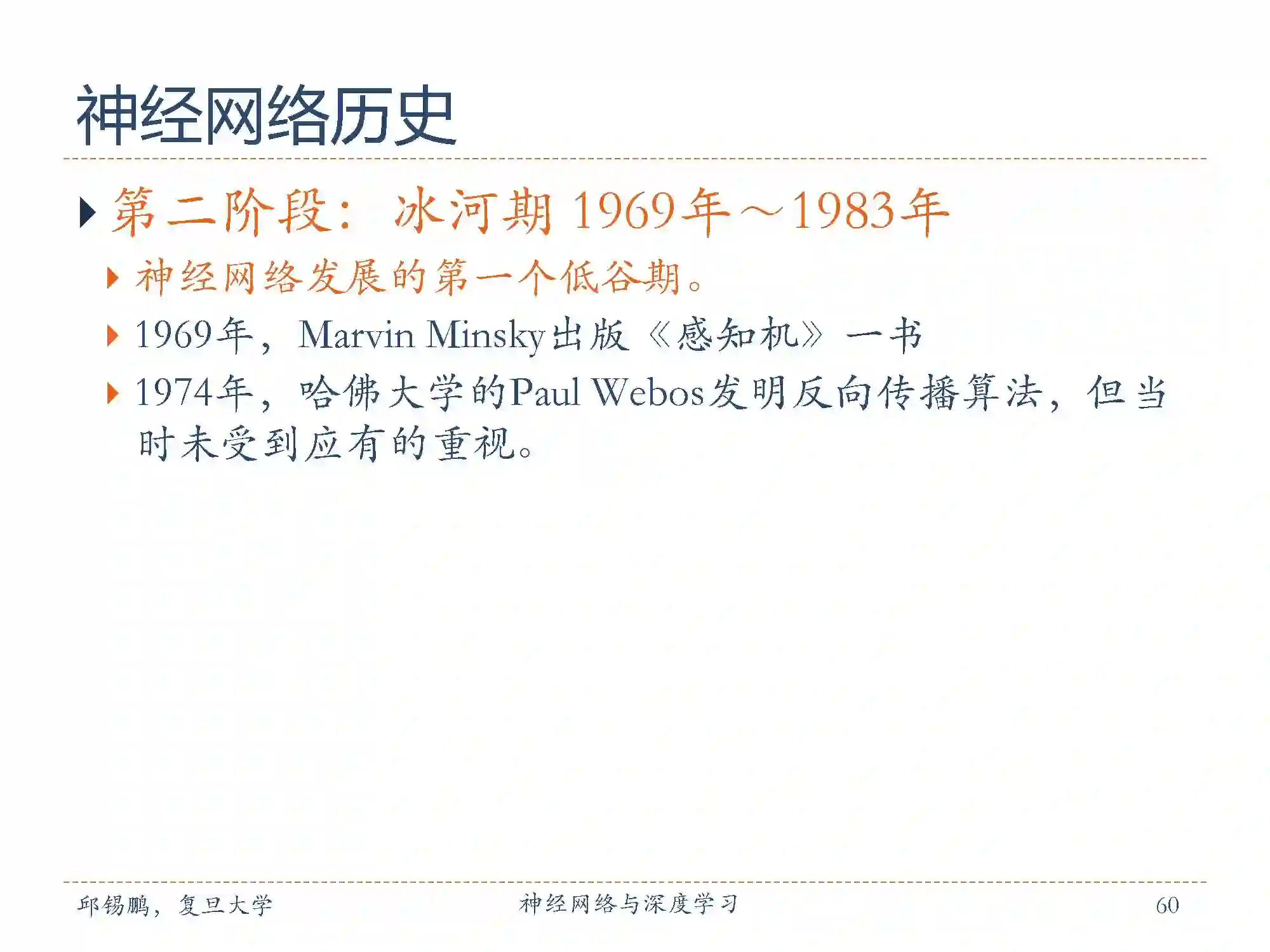 1969年,Marvin Minsky出版《感知机》一书,并和Seymour Papert发现了神经网络中的两个重大缺陷:第一是基本感知机无法处理异或问题;第二,当时的计算机计算能力不足以用来处理大型神经网络,此后一段时间神经网络的研究一度停滞不前。