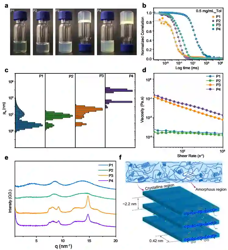 作者对P1-P4的甲苯溶液(10 mg/mL)静置10 ~ 20 min后发现,P3和P4的溶液呈现凝胶化,而P1和P2依然为澄清透明的溶液状态。对聚合物的稀溶液(0.5 mg/mL)进行动态光散射(DLS)测试表明,随着酰胺侧链比例的提高,分子链的流体力学半径(Rh)逐渐增大,说明由于聚合物链间氢键作用,分子链主要以相互缠结的聚集体存在。作者进一步对其溶液的粘度进行表征发现,P3和P4的甲苯溶液呈现明显的剪切变烯现象,主要是由于链间氢键在剪切外力作用下的破坏。结合WAXS和GIXRD测试发现,与P1和P2相比,P3和P4都具有明显的结晶衍射峰,说明分子链在薄膜状态下的堆积方式更加有序,而这种有序结构主要是由于链间氢键的相互作用。由此作者得出结论,引入氢键是实现共轭分子链长程有序排列的有效策略。