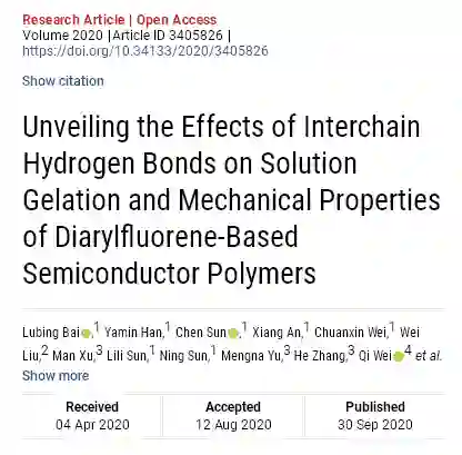 近期,面向柔性光电子器件的可控制备,西北工业大学黄维院士团队和南京工业大学林进义教授提出超分子功能化策略,在光电高分子侧基引入动态可逆的超分子弱作用,在保证材料高稳定性光电性质的同时,实现材料薄膜本征可拉伸特性,创造性提出薄膜原位剥离方法实现薄膜本征机械特性的精准表征,为定性定量化光电高分子柔性行为提供了一种普适性测试手段,为设计柔性高分子材料及其本征机械特性评估提供指导。在该工作中,黄维院士团队成员在活性共轭聚合物侧链引入不同比例的酰胺基团,系统研究了链间动态可逆超分子氢键作用对溶液凝聚态性质及聚合物薄膜本征柔性可拉伸性能的影响,相关成果以“Unveiling the Effects of Interchain Hydrogen Bonds on Solution Gelation and Mechanical Properties of Diarylfluorene-Based Semiconductor Polymers”为题,发表在Research上(Research, 2020, 3405826, DOI:10.34133/2020/3405826)。