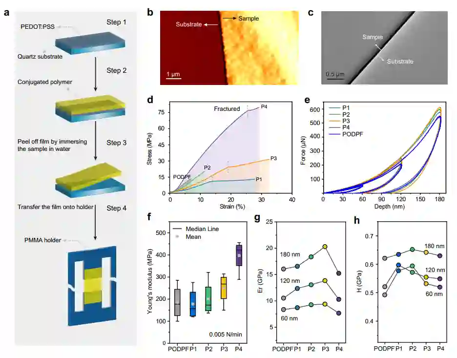 针对共轭聚合物薄膜的力学性能研究,目前已经报道的测试方法,如水面辅助的直接拉伸(film-on-water,FOW)以及弹性体支撑的应力测试(film-on-elastomer,FOE)等,对测试设备要求严苛,且结果易受到水表面张力的影响。作者通过改进制样方式并充分利用传统应力拉伸测试设备(DMA Q800),实现了薄膜本征力学性能的表征,材料用量少,测试方便。研究发现,聚芴薄膜均表现为脆性断裂(P1、P3和P4断裂点之后的曲线是由于薄膜从边缘撕裂引起的,并非发生应力屈服),且薄膜断裂伸长率随着链间氢键的增多而有所提高。对于杨氏模量,当氢键比例增加到40%时,才呈现显著提高,约为400 Mpa,说明链间氢键会使薄膜的强度更高、更有韧性。此外,作者还对比了纳米压痕的测试数据发现,所得结果受薄膜衬底效应的影响较大。