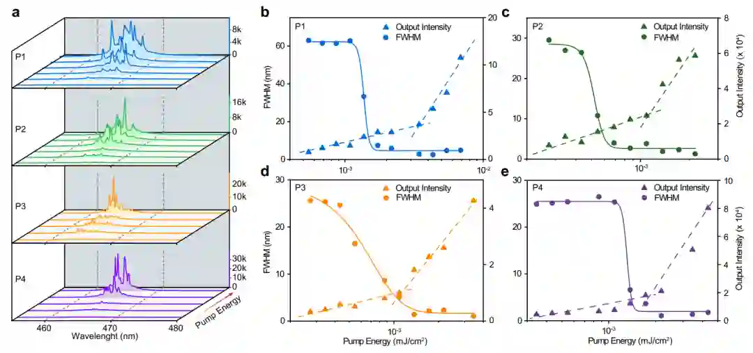 此外,作者采用飞秒激光器对薄膜的光增益性能进行了表征,在泵浦能量超过一定值后,P1-P4发射峰的半峰宽迅速窄化,并产生随机激光发射,阈值分别为1.38、0.52、0.70和1.32 µJ/cm2,以上结果说明薄膜具有优异的光增益性能。作者认为随机激光产生的主要原因是薄膜内部存在链间氢键交联形成的随机反馈腔,并进一步通过傅里叶变换(Fourier transform,FT)对微反馈腔的尺寸进行估算,约为30 ~ 60 µm。这些结果表明:氢键功能化的芴基聚合物具有优异的光增益性能,在有机激光器等领域具有潜在的应用。