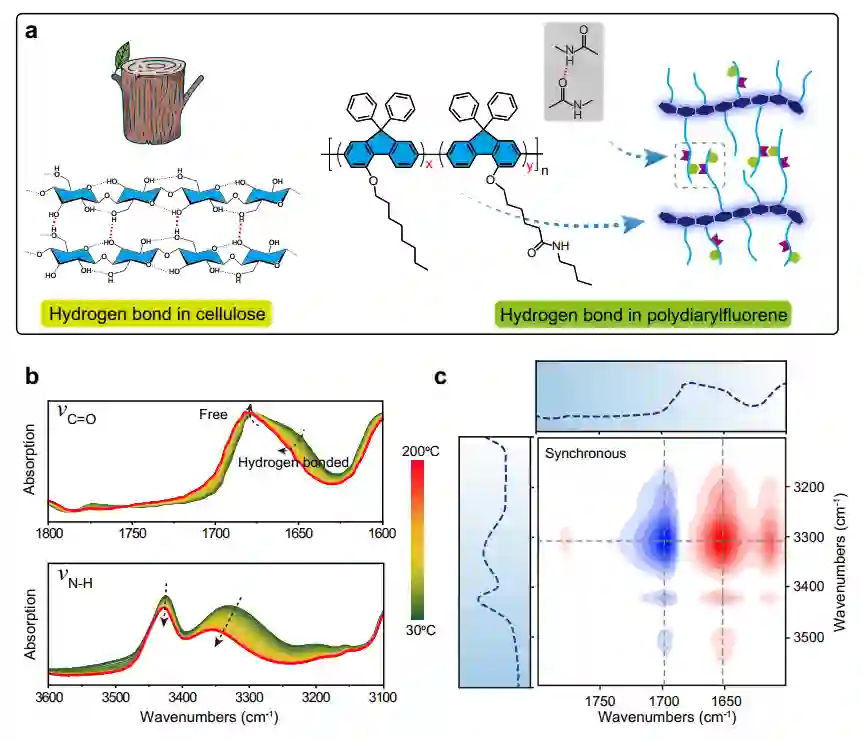 本文中,作者在聚芴侧链引入不同比例的酰胺侧链(10% ~ 40%),从而使共轭主链之间形成氢键交联网络,并通过变温FT-IR对其进行了验证。随着温度升高,3330 cm-1处(N-H)的峰值变化与1680 cm-1处(游离C=O)的峰值变化之间是正相关的,与1650 cm-1处(键合C=O)的峰值变化是负相关的,即温度升高使氢键断裂,键合的羰基减少,游离的羰基增多,充分说明聚芴分子链间氢键的形成。
