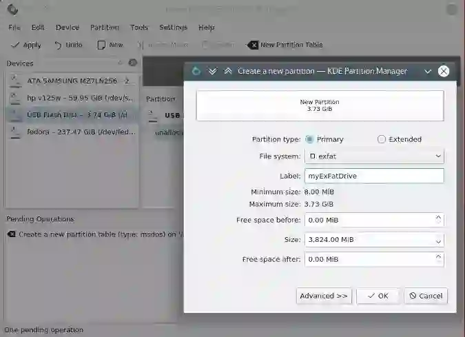 一旦你安装了 exFAT 支持,你可以在驱动器上你创建好的分区中创建一个 exFAT 文件系统。