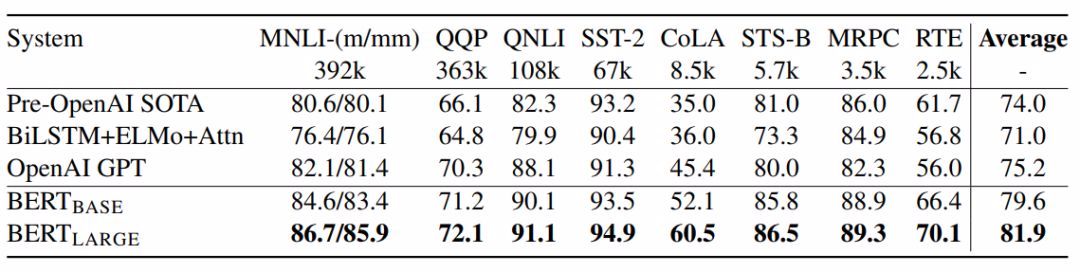表1:GLUE测试结果,评分由GLUE评估服务器得到。每个任务下面的数字表示训练样本的数量。「Average」列与GLUE官方分数略微不同,因为我们排除了有问题的WNLI集。OpenAI GPT = (L=12, H=768, A=12);BERT_BASE = (L=12, H=768, A=12);BERT_LARGE = (L=24, H=1024, A=16)。BERT和OpenAI GPT是单个模型、单个任务。