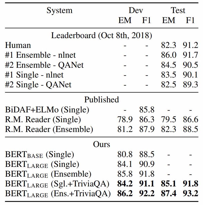 表2:SQuAD结果。BERT集成是使用不同预训练检查点和微调种子(fine-tuning seed)的7x系统。