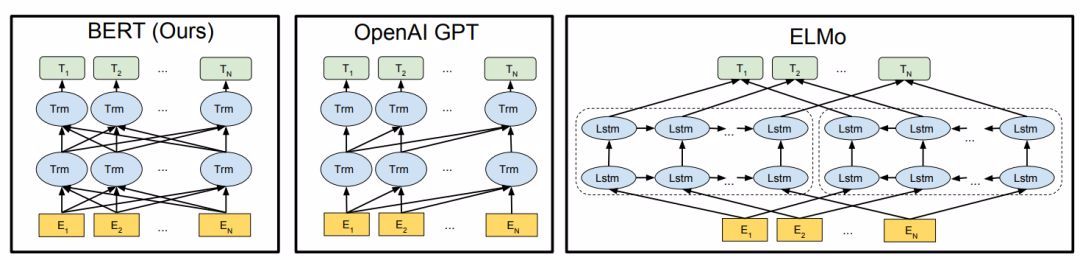 图1:预训练模型架构之间的区别。BERT使用双向Transformer,OpenAI GPT使用从左到右的Transformer,ELMo使用独立训练的从左到右和从右到左LSTM的级联来生成下游任务的特征。三种模型中,只有BERT表征会基于所有层中的左右两侧语境。