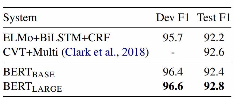 表3:CoNLL-2003命名实体识别结果。超参数通过开发集来选择,得出的开发和测试分数是使用这些超参数进行五次随机restart的平均值。